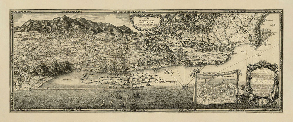 Este exquisito mapa, "Plan du siége de la ville de Barcelone", realizado por el famoso Sébastien Pontault de Beaulieu en 1697, ofrece una visión fascinante del asedio histórico de Barcelona. Como una vista aérea magistral, detalla intrincadamente las maniobras militares estratégicas de las fuerzas francesas durante la Guerra de la Gran Alianza. El mapa abarca la costa mediterránea desde Cap Cerbère hasta el río Llobregat, mostrando la meticulosa planificación y disposición de las tropas mientras asediaban esta ciudad vital. El arte y la precisión del trabajo de Beaulieu brindan una representación informativa y visualmente impactante de este momento crucial en la historia europea.