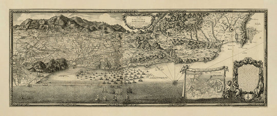 El diseño del mapa refleja las ricas tradiciones cartográficas de finales del siglo XVII, combinando el talento artístico con la precisión militar. El relieve pictórico ilustra vívidamente la topografía de la región, destacando el terreno montañoso y las posiciones costeras estratégicas. Cabe destacar que el mapa incluye representaciones detalladas de las líneas de asedio, las fortificaciones y las fuerzas navales en el mar Mediterráneo, lo que ofrece una visión integral de la complejidad del conflicto. La atención de Beaulieu al detalle se extiende a los bordes artísticos y los elementos decorativos, que realzan el atractivo estético y el valor histórico del mapa.