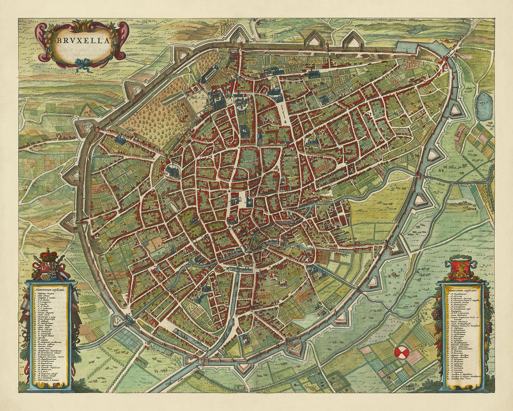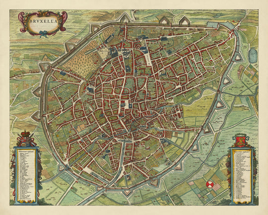 El mapa de Bruselas está rodeado por sus murallas fortificadas, una característica que subraya la importancia estratégica y la destreza defensiva de la ciudad durante el siglo XVII. Las fortificaciones están ilustradas meticulosamente, proporcionando una fascinante visión de la arquitectura militar de la época. Dentro de estas murallas se encuentra un paisaje urbano vibrante, repleto de más de 80 puntos de interés, cada uno meticulosamente identificado en las leyendas que lo acompañan. Este nivel de detalle hace que "Bruxella" no sea solo un mapa, sino un documento histórico que captura la esencia de Bruselas en su apogeo.