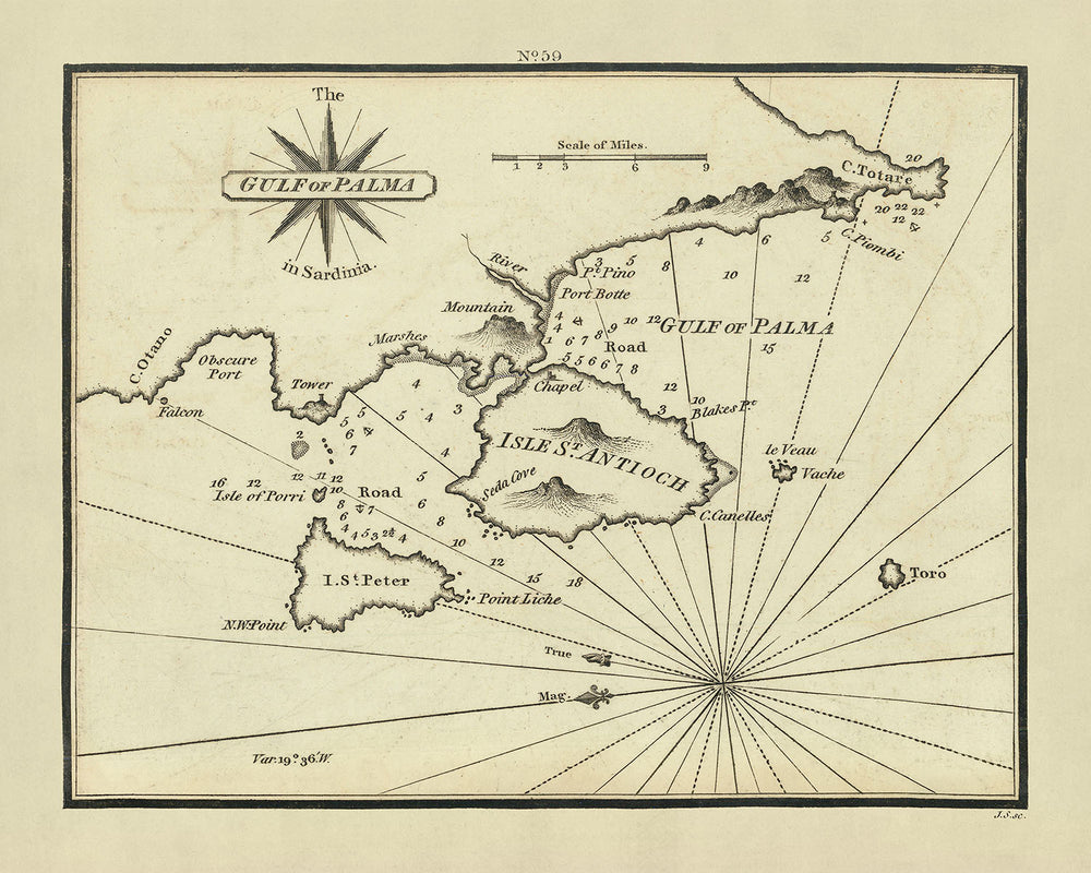 Antigua carta náutica del golfo de Palma de Heather, 1802: Cerdeña, Sant' Antioco, Isola di San Pietro