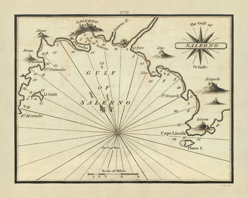 Este mapa refleja más que solo información geográfica; es un espejo de las dinámicas históricas y culturales de principios de 1800. El Golfo de Salerno, ubicado en la región de Campania en Italia, es rico en historia y leyenda, con pueblos como Amalfi y Salerno y monumentos como las antiguas ruinas de Pompeya. Al incluir estos elementos, el mapa de Heather no solo guió a los marineros a través de estas aguas, sino que también los conectó con el pasado legendario de la región, aumentando el atractivo y el valor académico del mapa.