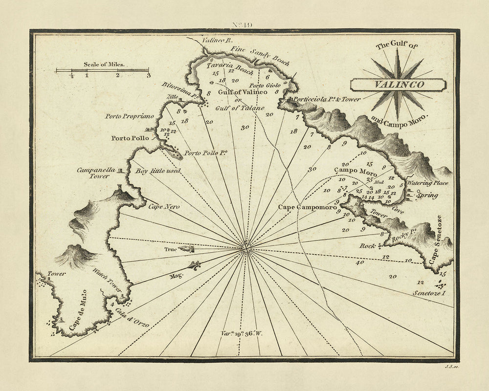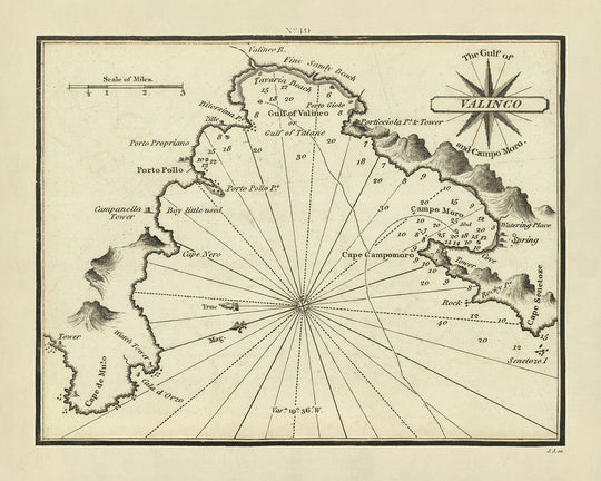 La carta de Heather es un tesoro de información náutica, detallando meticulosamente las bahías de Campo Moro y el amplio Golfo de Valinco. Los marineros de la época dependían de tales cartas para un paso seguro a través de estas aguas, conocidas por sus costas complejas y peligros ocultos. El mapa muestra una variedad de sondeos de profundidad y pasajes, esenciales para evitar peligros submarinos y navegar de manera segura por las intrincadas costas. Las características costeras también están elaboradamente cartografiadas, con montañas, playas, lugares de agua y torres históricas claramente marcadas, proporcionando no solo orientación de navegación, sino también información sobre los recursos terrestres disponibles para los marineros.