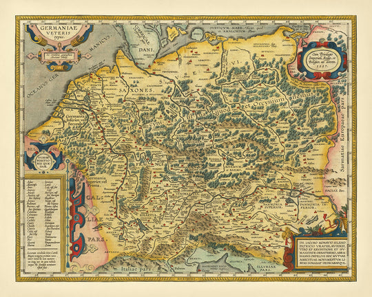 Descubre la exquisita artesanía de Abraham Ortelius con el "Germaniae Veteris Typus", un mapa cautivador que te transporta al corazón de la antigua Europa. Originalmente dibujado en 1587 y publicado en 1624, este mapa es un testimonio del dominio de Ortelius y su profundo interés en la antigüedad clásica. Conocido como el creador del primer atlas moderno, Ortelius combina intrincadamente la geografía con la historia, ofreciendo una ventana al pasado a través de la lente de eruditos estimados como Plinio, Estrabón y Tácito.