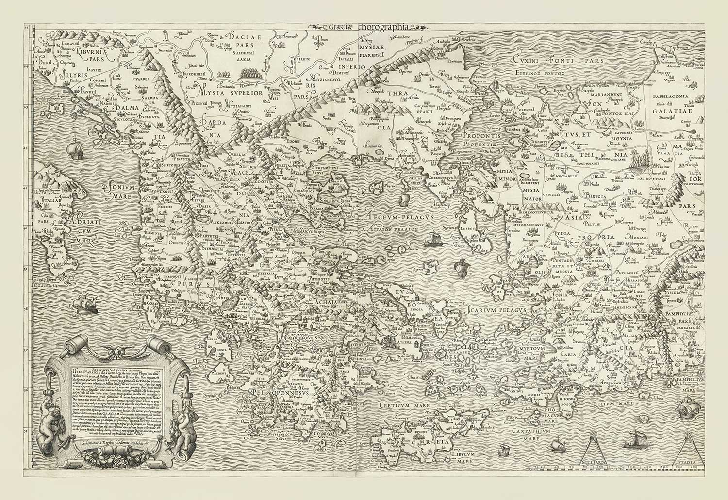 Mapa antiguo de Grecia, 1558 por Salamanca: Macedonia, Balcanes, Creta, Rodas, Turquía, Corfú