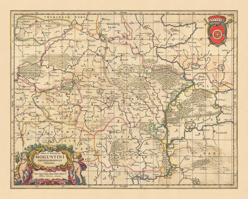 Esta notable pieza, 'Nova Et Accurata Moguntini Archiepiscopatus delineatio', o en inglés, 'Delineación nueva y precisa del Arzobispado de Mainz', es una impresionante representación del Arzobispado de Mainz, un importante principado eclesiástico del Sacro Imperio Romano, ubicado en la zona más amplia de la Alemania actual. Diseñado por Nicolaes Visscher II en 1690, ofrece una perspectiva única del panorama político y geográfico de la época.