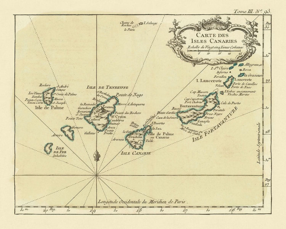 El mapa de Bellin ofrece una visión fascinante de la geografía de las Islas Canarias, destacando islas clave como Gran Canaria, Tenerife y Palma. El mapa está adornado con elementos náuticos, incluidas rosas de los vientos y líneas loxodrómicas, que subrayan su propósito principal como herramienta de navegación. Estas características no solo se suman al atractivo estético del mapa, sino que también sirven como testimonio de la destreza marítima de la época, cuando las islas eran un centro estratégico para exploradores y comerciantes.