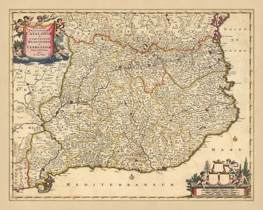 Este mapa no es simplemente una representación geográfica; es un artefacto histórico que ofrece una visión de las divisiones políticas y los límites administrativos de la época. Las regiones del Rosellón y la Cerdaña, por ejemplo, están claramente delimitadas, lo que refleja su importancia histórica. Canales, bosques, canales y montañas están intrincadamente grabados en el mapa, mientras que los cartuchos decorativos y una rosa de los vientos añaden atractivo estético.