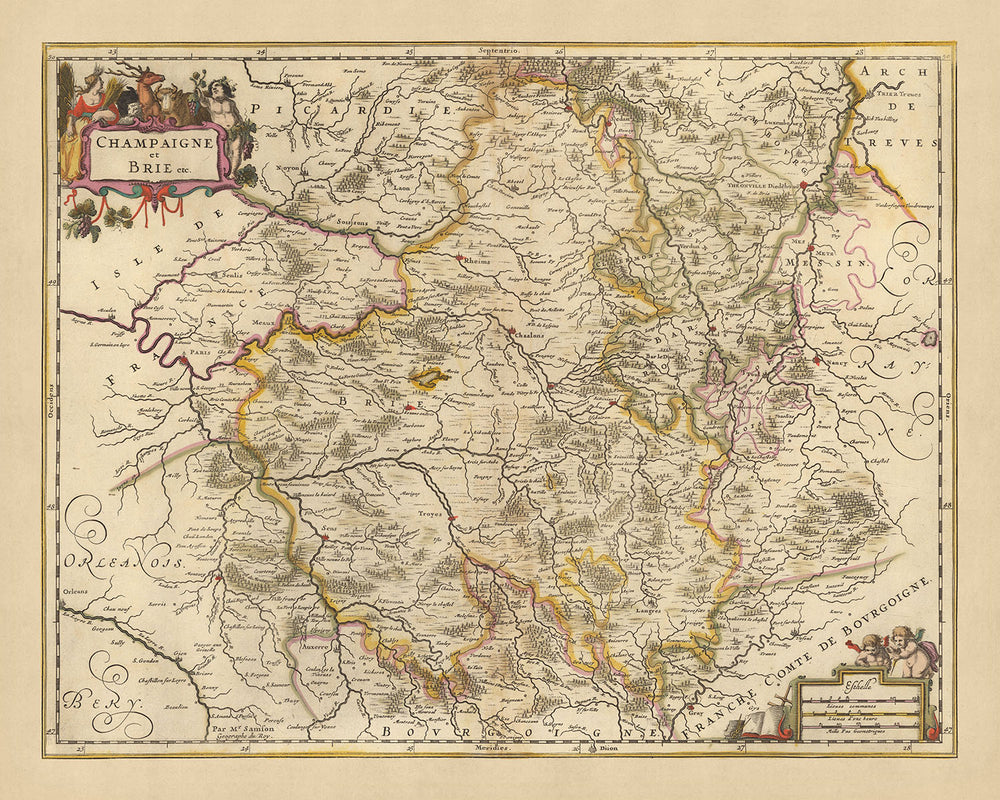 El 'Champaigne et Brie etc' no es sólo un mapa; es un pedazo de historia que cuenta historias del pasado, de la gente y de la tierra. El relieve que se muestra pictóricamente proporciona una sensación de profundidad, lo que lo convierte en algo más que una simple representación plana. Ofrece la oportunidad de viajar en el tiempo, explorar los paisajes y las divisiones políticas de una época pasada. Este mapa es imprescindible para quienes aprecian el arte de la cartografía y el rico tapiz de historia que representa.