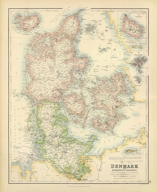 Mapa antiguo de Dinamarca y Schleswig-Holstein, 1872 por Fullarton: Islandia, Islas Feroe, Reino de Dinamarca, Zelanda, Copenhague