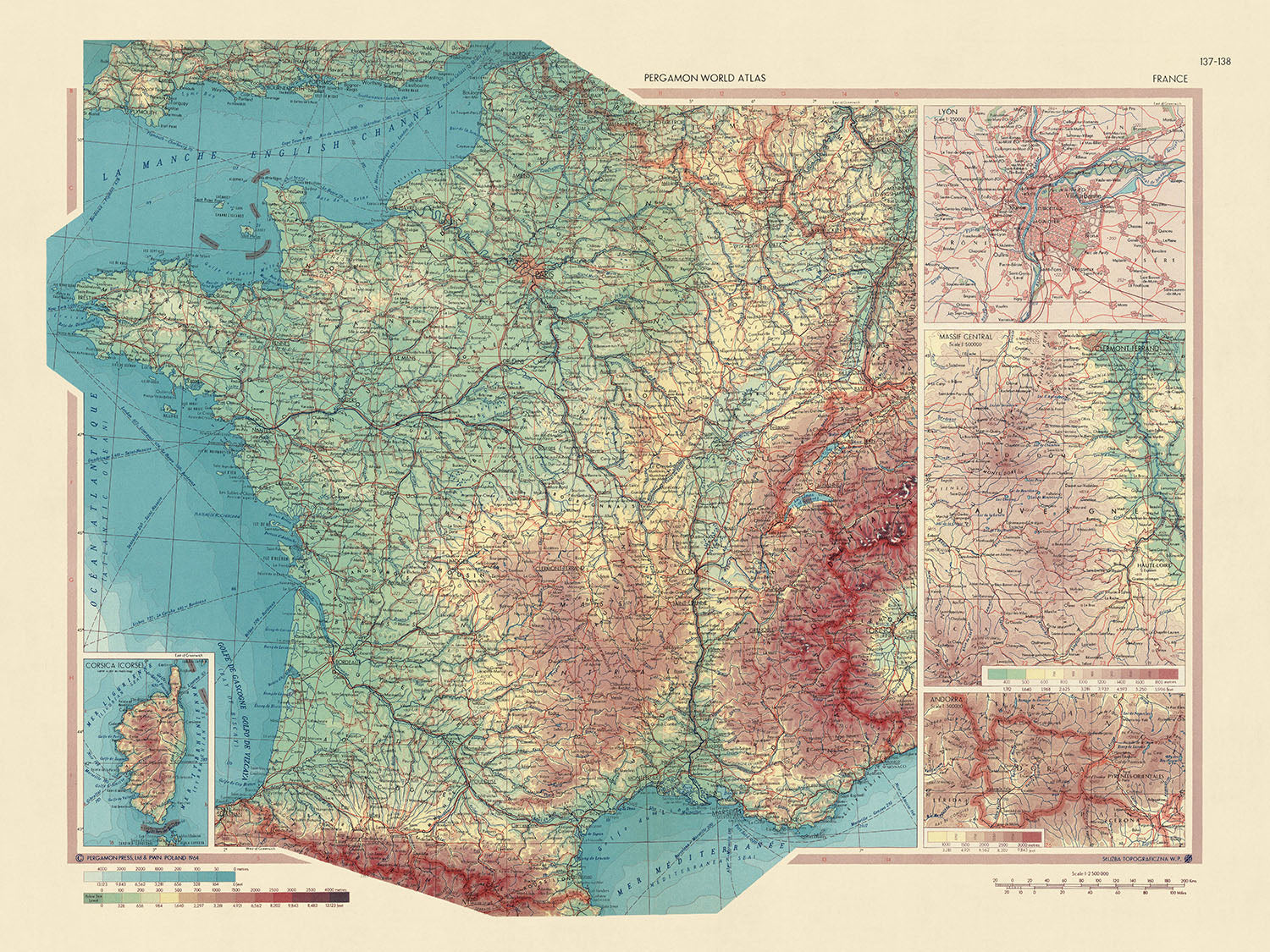 El mapa está marcado por su meticuloso detalle, capturando la esencia de la geografía física y política de Francia. El terreno ondulado del país, desde los ondulados viñedos de Burdeos hasta los escarpados picos de los Alpes, está bellamente representado. El mapa también proporciona una visión en profundidad de las fronteras políticas de Francia, ofreciendo información sobre las divisiones administrativas de la nación y su evolución histórica. La inclusión de tres mapas detallados (Andorra, Macizo Central y Lyon) enriquece aún más el contenido del mapa y ofrece una comprensión más matizada de estas regiones.