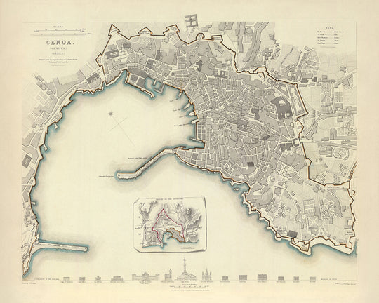 El diseño y estilo del mapa reflejan los altos estándares de la cartografía del siglo XIX, con un enfoque tanto en la utilidad como en el atractivo estético. Las grabados coloreados a mano y las ilustraciones detalladas hacen de este mapa una verdadera obra de arte, mientras que su importancia histórica se subraya por su publicación bajo los auspicios de la Sociedad para la Difusión del Conocimiento Útil. Este mapa no es solo una herramienta de navegación, sino un documento histórico que ofrece una visión única del paisaje urbano y cultural de Génova, convirtiéndolo en una valiosa adición a cualquier colección de mapas históricos.