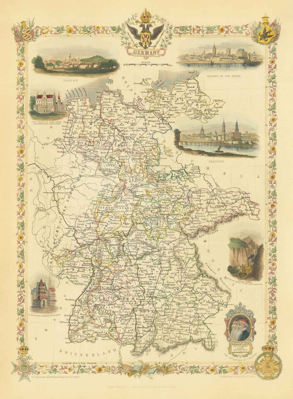 Grabado por John Rapkin y publicado por J. Tallis & Co en 1851, este es uno de los mapas históricos de Alemania más finos y detallados.