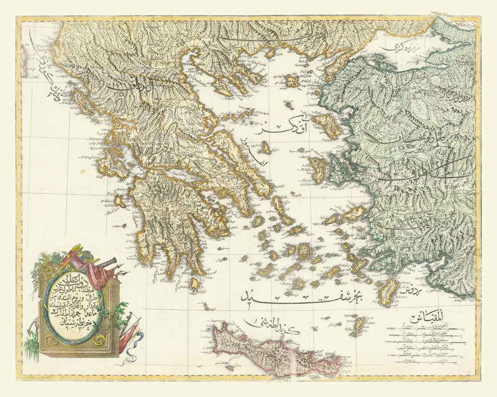 Antiguo mapa árabe de Grecia y Turquía, Raif Efendi, 1803: Atenas, Creta, las Cícladas, las islas Jónicas y el Peloponeso