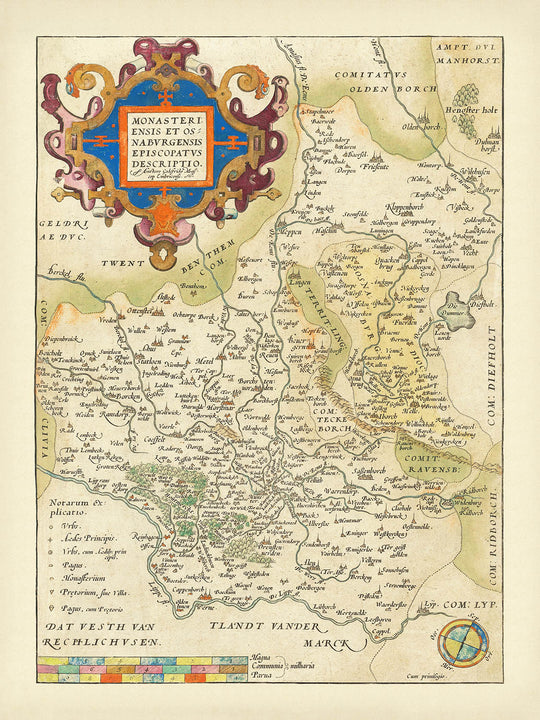 La importancia histórica de este mapa se extiende más allá de su precisión geográfica. Refleja la curiosidad intelectual del período renacentista y el deseo de documentar y comprender el mundo con mayor detalle. Como objeto de colección, ofrece una conexión tangible con el pasado, permitiendo explorar los intrincados detalles de una región rica en historia y cultura. La "Monasteriensis Et Osnaburgensis Episcopatus Descriptio" no es solo un mapa; es una ventana a una era pasada, capturando la esencia de un tiempo en que la cartografía era tanto un arte como una ciencia.