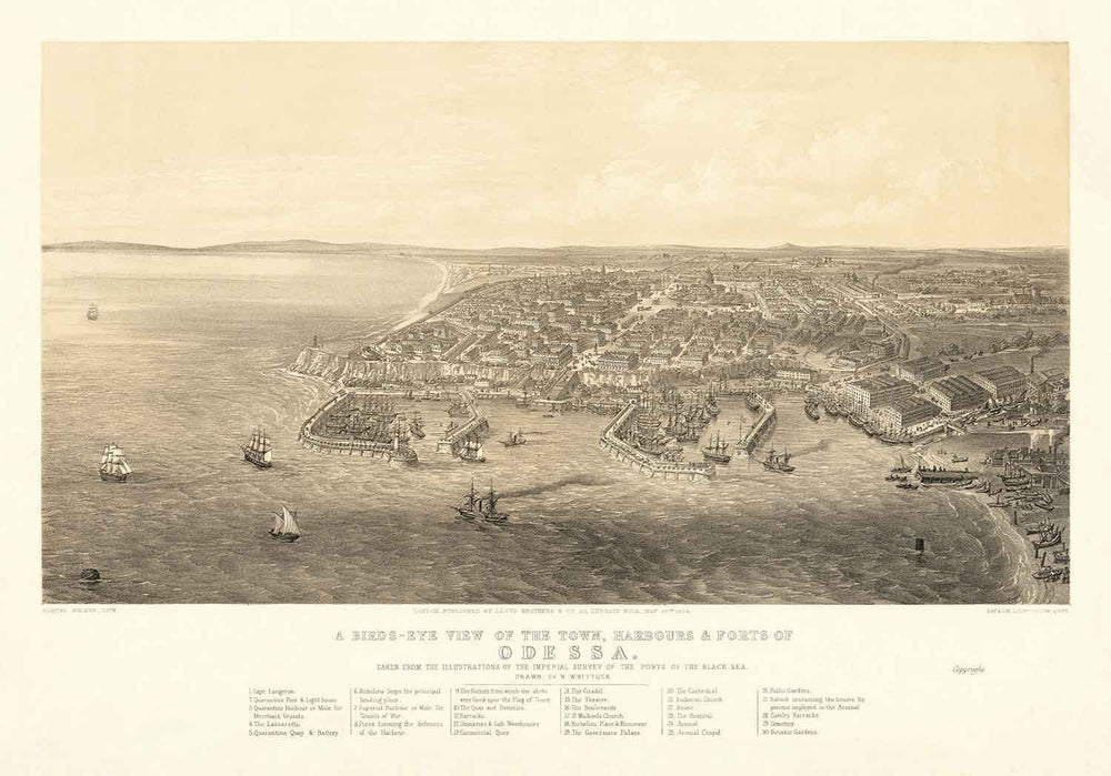 Una vista de pájaro encantadora y excepcionalmente rara de Odessa, publicada originalmente en 1855 por N. Whittock de Londres.