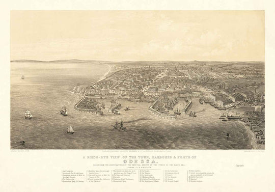 En ese momento, al igual que hoy, Odessa era en gran medida una ciudad portuaria. La clave en la parte inferior del mapa puede ayudarte a localizar 30 puntos de interés, aunque no muchos de ellos todavía existen hoy en día. El mapa muestra Odessa desde un punto justo al norte del antiguo centro de la ciudad, con el Cabo Langeron a la izquierda.