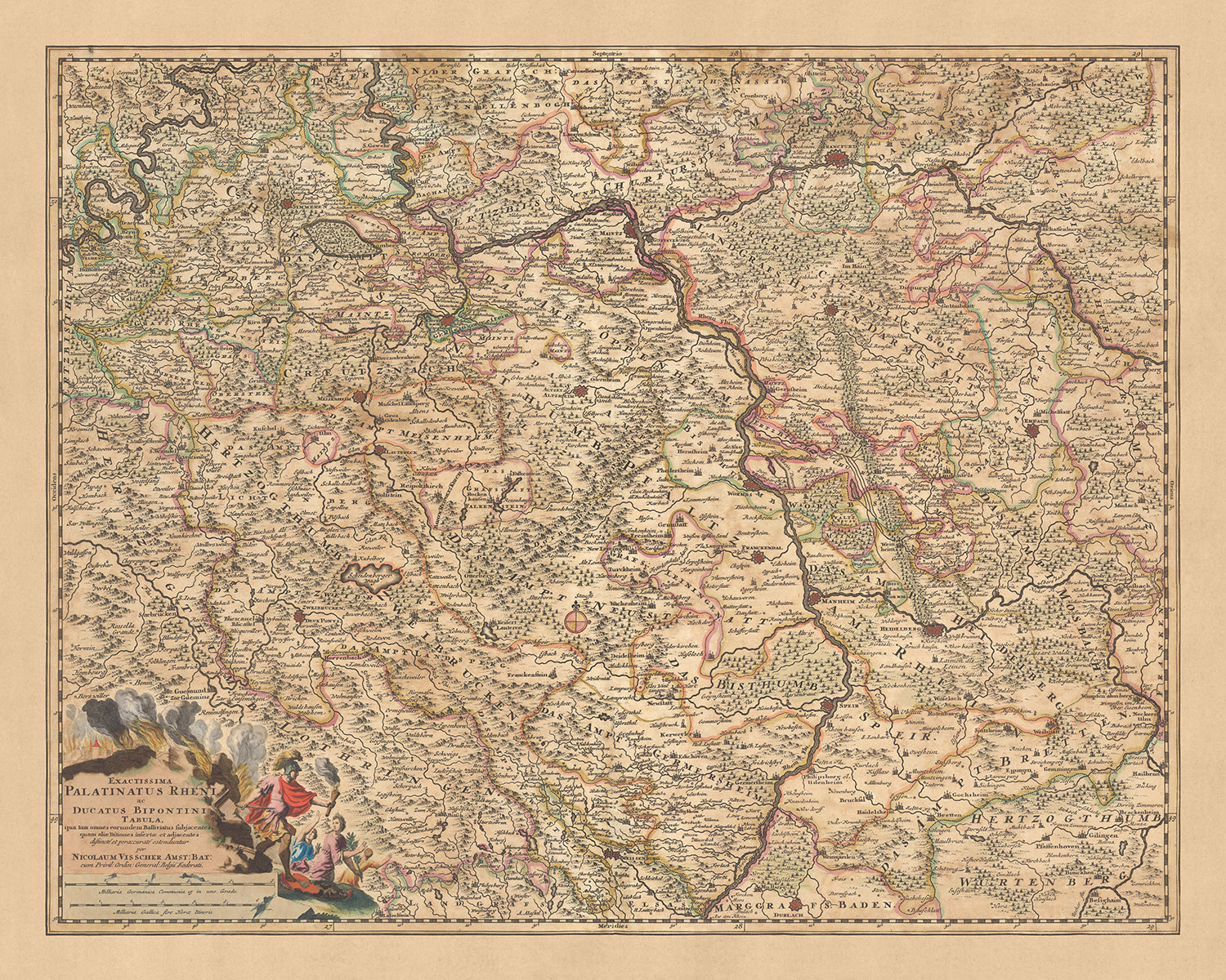 Mapa antiguo del Rin Palatinado y Ducado de Zweibrücken, Visscher, 1690: Frankfurt, Mannheim, Saarbrücken, Mainz, Darmstadt