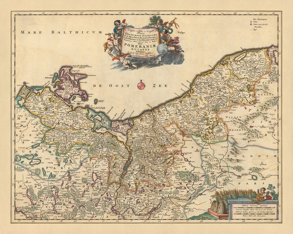 Además de las ciudades y los paisajes naturales, el mapa también muestra las fronteras políticas del Ducado de Pomerania. La división de la región en unidades administrativas más pequeñas, cada una con su escudo de armas distintivo, es una característica convincente que subraya la complejidad política de la época. Por tanto, el mapa no sólo proporciona una visión geográfica sino que también sirve como documento histórico, reflejando la dinámica sociopolítica de finales del siglo XVII.