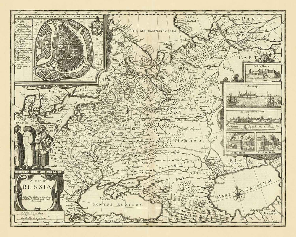 En la esquina superior izquierda hay un mapa muy detallado de Moscú - una vista muy rara del siglo XVII. En el momento en que se hizo este mapa, Pedro el Grande acababa de convertirse en el Emperador de Rusia, y el país se extendía desde el Báltico en el este hasta el Pacífico en el oeste, convirtiéndolo en el país más grande del mundo - y también en uno de los menos poblados.