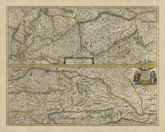 Gerhard Mercator, un nombre sinónimo de precisión en la cartografía, fue revolucionario en su campo. Conocido por la proyección de Mercator, su enfoque innovador permitió a los marineros navegar los mares con mayor precisión, cambiando el rumbo de la navegación para siempre. Junto con Jodocus Hondius, quien es celebrado por sus contribuciones al Atlas Mercator-Hondius, uno de los atlas seminales de la época, crearon mapas que no solo eran funcionales, sino también ricamente detallados y bellamente decorados. Su colaboración dio vida a este mapa de la cuenca del río Danubio, mostrando su incomparable habilidad para combinar la precisión científica con la elegancia artística.