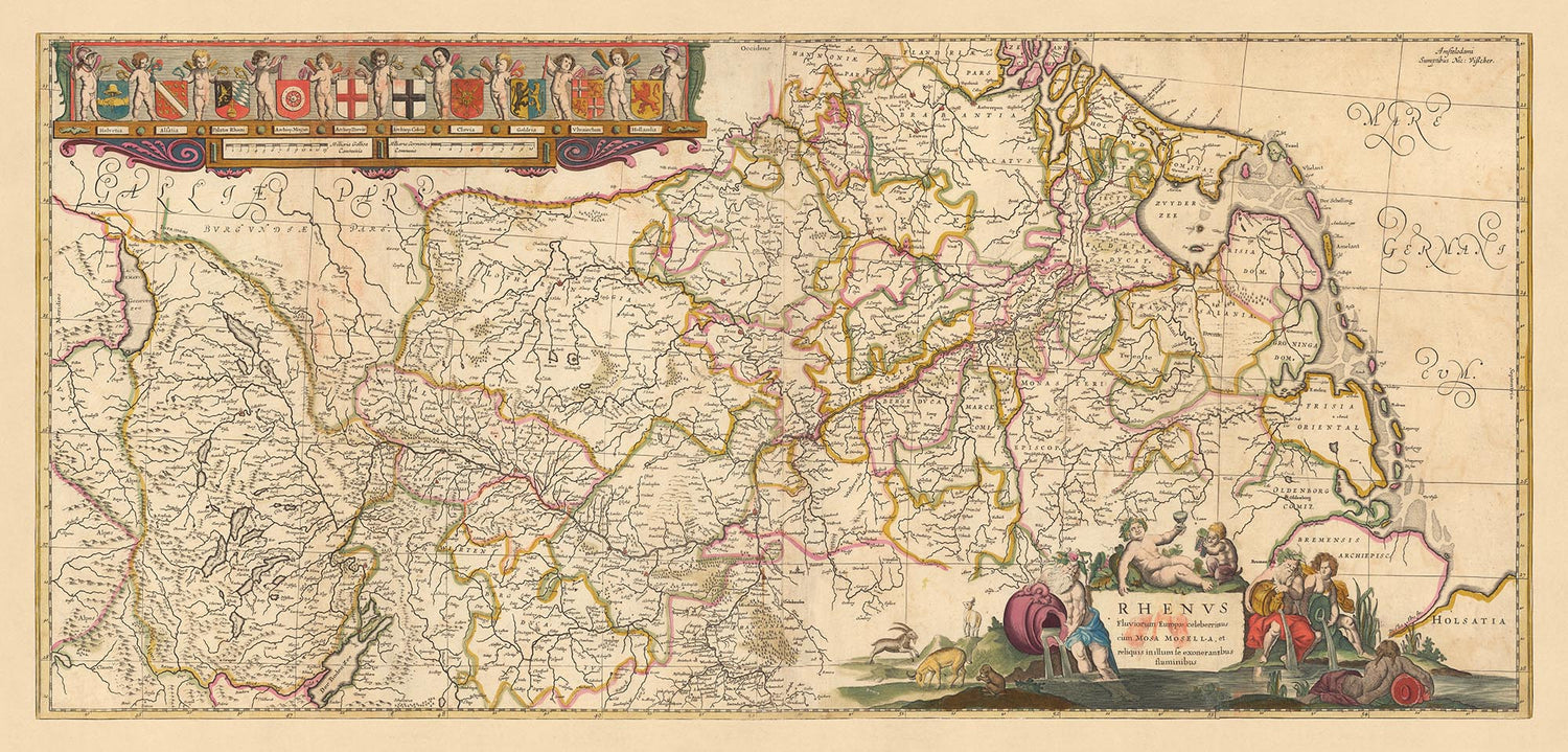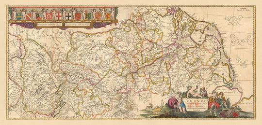 Sumérgete en la rica historia de Europa con este cautivador mapa del río Rin de 1690, elaborado por el renombrado cartógrafo Nicolaes Visscher II. El mapa, originalmente titulado 'Rhenus Fluviorum Europae celeberrimus cum Mosa, Mosella, et reliquis, in illum se exonerantibus, fluminibus', ofrece una descripción intrincada del paisaje político y geográfico de la época. Traducido, el título dice: "El Rin, el más famoso de los ríos de Europa, con el Mosa, el Mosela y los demás, que desembocan en él".