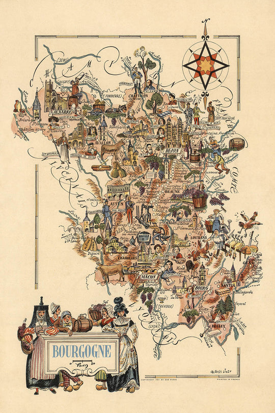 Antigua Mapa Pictórico de Borgoña (Bourgogne) por Liozu, 1951: Dijon, Beaune, Viñedos, Vino