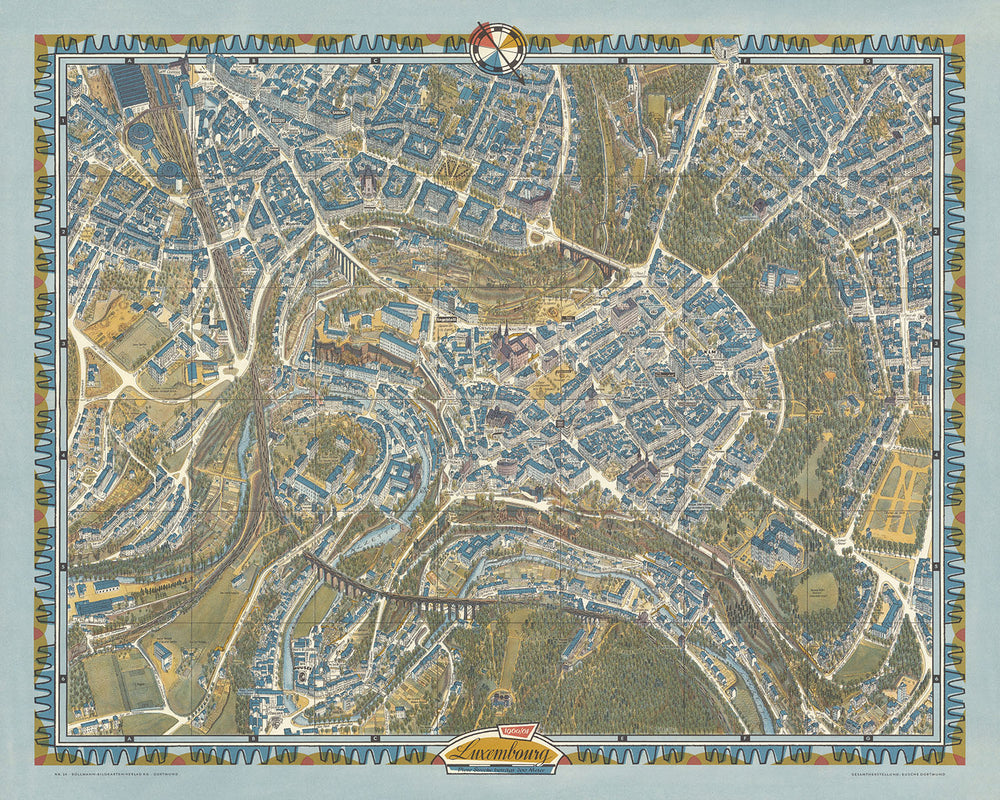 El "Mapa Pictórico de Vista Aérea de la Ciudad de Luxemburgo" creado por Hermann Bollmann en 1961 es una magistral combinación de arte y precisión cartográfica. Este mapa ofrece una cautivadora vista aérea de la Ciudad de Luxemburgo, mostrando su intrincado diseño urbano y la armoniosa mezcla de arquitectura histórica y moderna. Bollmann, un renombrado cartógrafo alemán, aportó su experiencia como artista gráfico a esta obra, creando una representación visualmente impresionante y altamente detallada de la ciudad. Su enfoque único, arraigado en la tradición alemana de las Vogelschaukarten, proporciona una perspectiva tridimensional que es tanto informativa como estéticamente agradable.