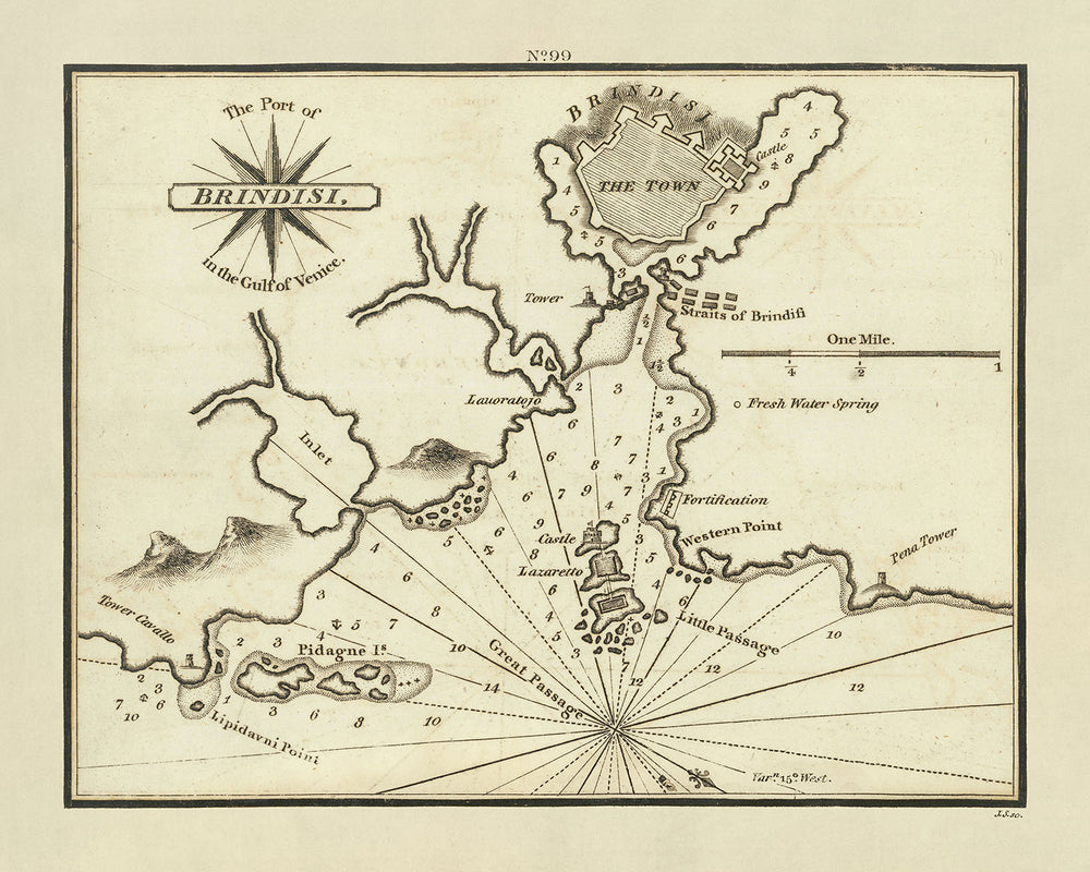 • El mapa muestra el Puerto de Brindisi, en el Golfo de Venecia (ahora el Mar Adriático).