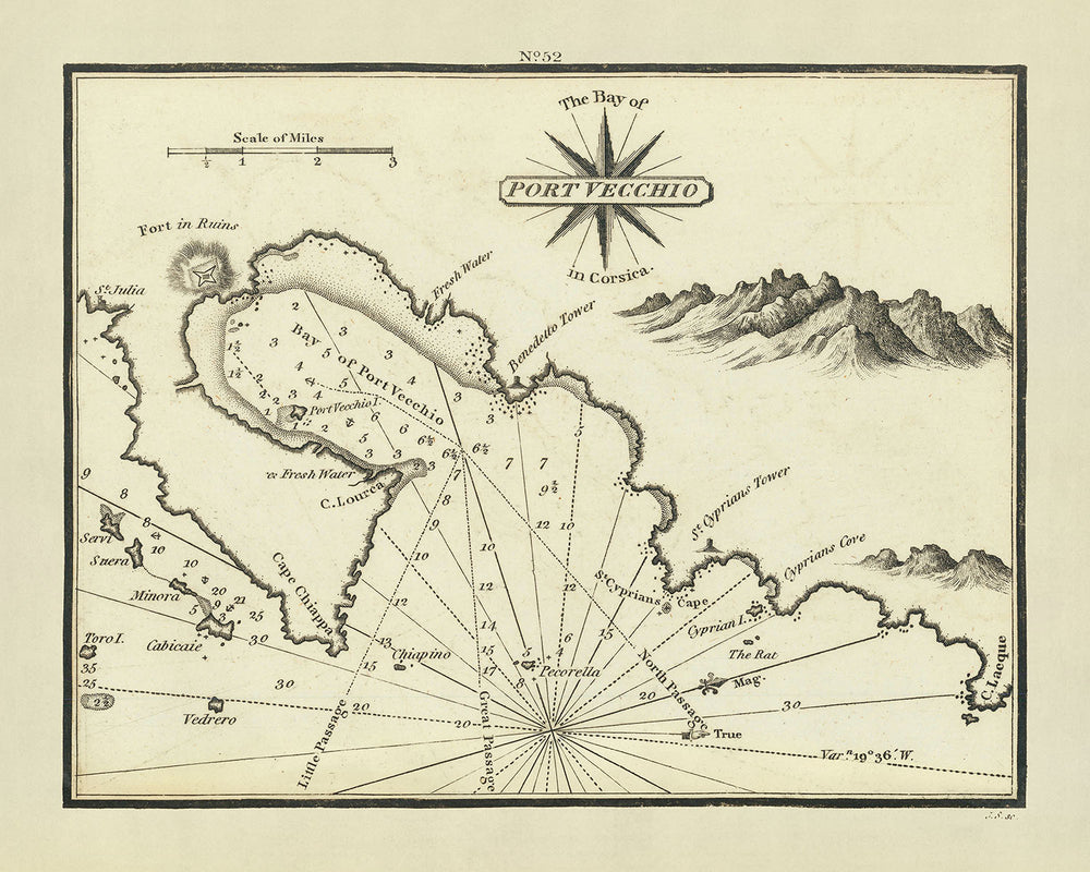 Antigua carta náutica de Porto-Vecchio por Heather, 1802: Batalla de las Íles Sanguinaires, naufragio de La Sémillante, Faro de Lavezzi
