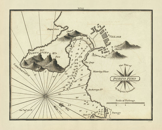 Más allá de su utilidad para la navegación, el mapa sirve como una instantánea histórica de la infraestructura marítima de Portofino durante principios del siglo XIX. Marca meticulosamente la ubicación de una capilla, una iglesia y la disposición del pueblo, ofreciendo un vistazo a la vida diaria de sus habitantes. El lugar de abastecimiento y el punto de anclaje destacados en el mapa son indicativos de la actividad bulliciosa que habría estado presente a medida que marineros y comerciantes frecuentaban este puerto. Estas características no solo añaden profundidad a la utilidad del mapa, sino que también enriquecen nuestra comprensión del papel de Portofino en la historia marítima del Mediterráneo.