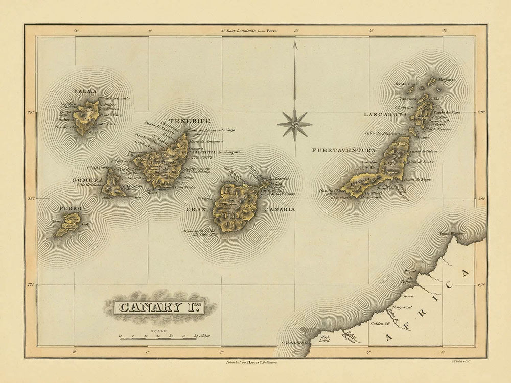 Mapa antiguo y raro de las Islas Canarias de Lucas, 1823: Tenerife, Gran Canaria, Rosa de los Vientos, Montañas, Atlántico