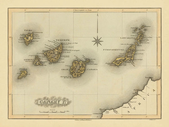 - Escasez: Uno de los primeros mapas comerciales detallados de las Islas Canarias publicados en América.