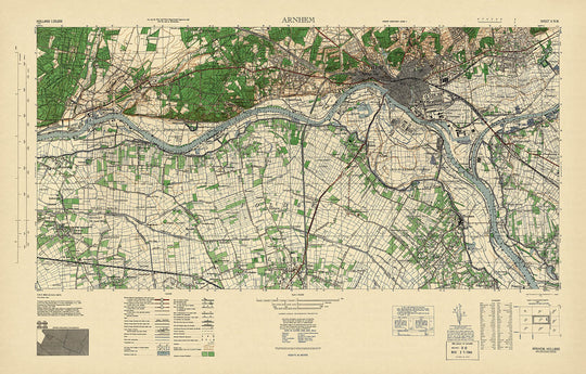 El mapa muestra la ciudad de Arnhem y sus áreas circundantes con una precisión notable. El relieve se ilustra artísticamente a través de contornos y alturas puntuales, mientras que las hachuras proporcionan profundidad adicional en hojas selectas. Este nivel de detalle fue crucial para entender el terreno y planificar los movimientos de tropas. El río Rin, destacado, era una barrera geográfica significativa que desempeñó un papel central en la estrategia de la operación, haciendo de este mapa no solo una pieza de historia, sino un testimonio de la cartografía militar.