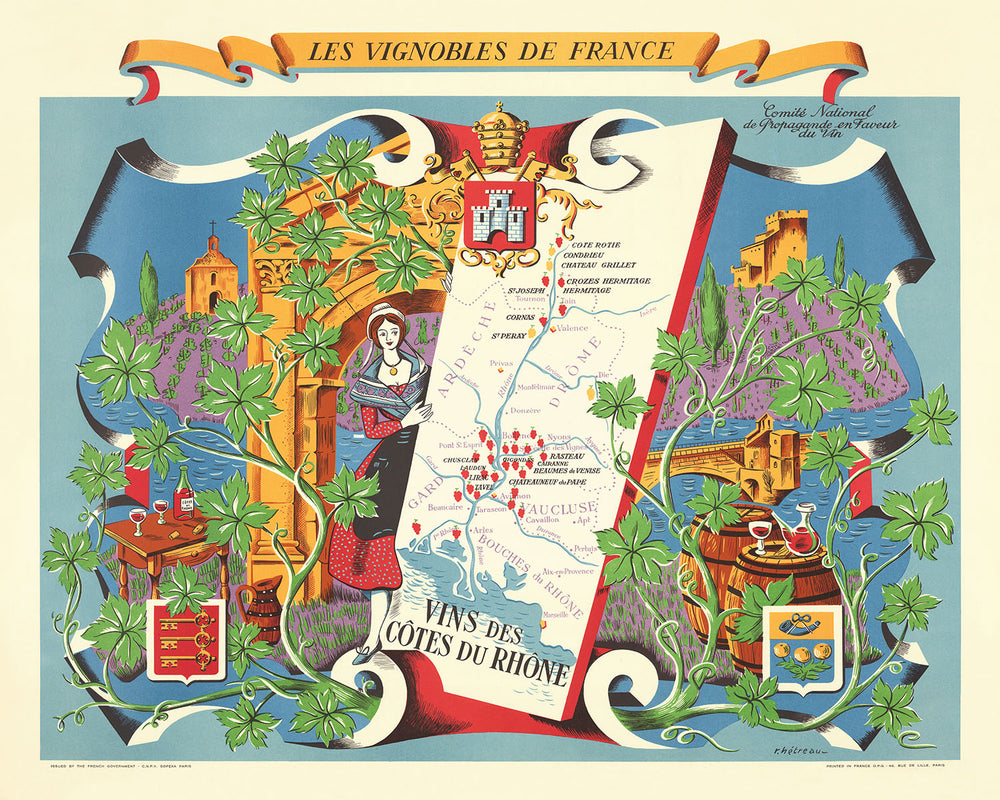 Históricamente, este mapa tiene un valor significativo, ya que resume la iniciativa del gobierno francés de mediados del siglo XX de promover su industria vitivinícola a través de representaciones visuales y temáticas. Refleja un período en el que Francia estaba ansiosa por afirmar su destreza cultural y económica en el mercado mundial del vino. La maestría artística de Rémy Hetreau y los intrincados detalles del mapa lo convierten en una pieza preciada tanto para coleccionistas como para conocedores, ofreciendo una ventana a la rica historia y tradición de la región vinícola de Côte du Rhone.