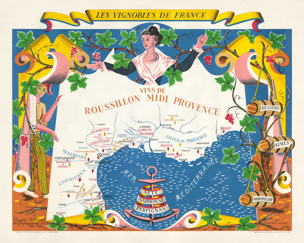 Presentamos el exquisito "Les Vignobles De France - Vins De Roussillon Midi Provence", una obra maestra de 1954 del reconocido artista y cartógrafo francés Rémy Hetreau. Este mapa, parte de una ilustre serie encargada por el Comité National de Propagande en Faveur du Vin, captura maravillosamente la esencia de las regiones vinícolas de Roussillon y Provenza. Hetreau, célebre por sus grabados y su destreza ilustrativa, aporta su toque artístico único a este mapa, convirtiéndolo no solo en una representación geográfica, sino en una obra de arte que rezuma el encanto y la elegancia de la Francia de mediados del siglo XX.