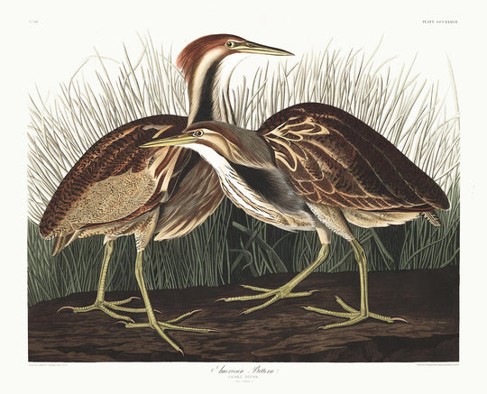 Los naturalistas observadores notarán que en esta ilustración hay un Bittern Americano macho y hembra. El macho está a la izquierda, con el plumaje de cabeza más prominente. ya no existe. En ese momento, Audubon nombró a este pájaro como ardea minor, pero desde entonces ha sido reclasificado como Botaurus lentiginosus. Esta ave zancuda se puede encontrar casi exclusivamente en América del Norte; cría en Canadá y Groenlandia, y pasa el invierno en el Golfo de México.