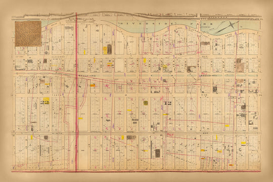 Riverside Park, un importante espacio verde de la zona, ocupa un lugar destacado, proporcionando a los espectadores contemporáneos una idea de los paisajes recreativos disponibles para los neoyorquinos de la época. El bulevar, ahora conocido como Broadway, divide el mapa en dos, revelando su importancia como vía incluso en el siglo XIX. Este mapa también arroja luz sobre las tuberías de agua originales y la ubicación de las bocas de incendio, lo que indica la infraestructura inicial que sustentaba la creciente ciudad. Los tonos rosados y amarillos utilizados para denotar varios tipos de uso de la tierra y las anotaciones agregadas al mapa enriquecen aún más la narrativa histórica resumida en esta única hoja.