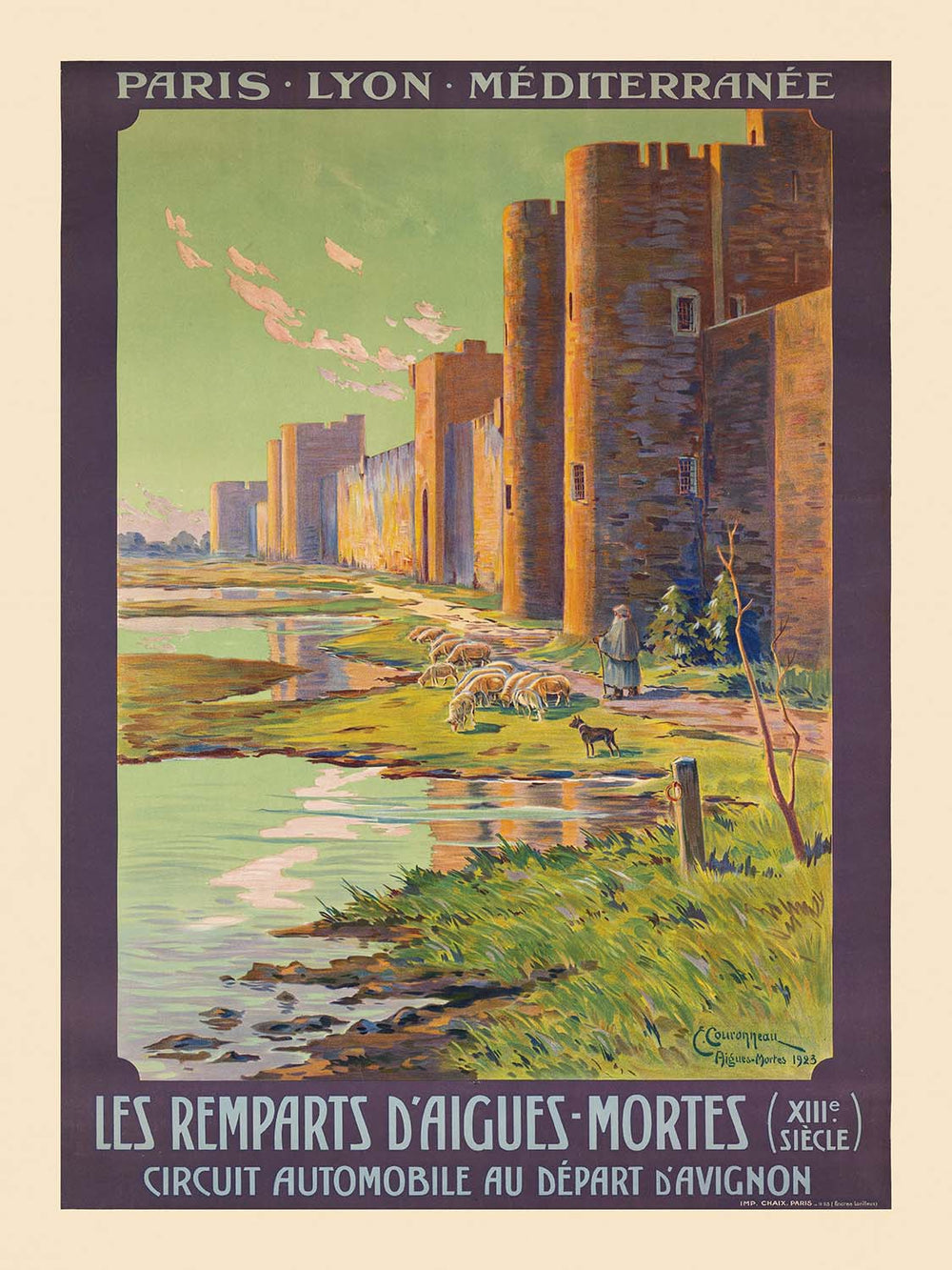 Les Remparts d’Aigues-Mortes by Ernest Couronneau (1923) is a luminous Art Deco travel poster celebrating the storied medieval walls of Aigues‑Mortes in southern France. Created at the dawn of modern leisure tourism, it captures the fortified silhouette rising over calm waterways at the edge of the Camargue, where salt marshes, sky, and stone meet. Couronneau’s stylized composition invites viewers to linger on the 13th‑century ramparts—an enduring landmark commissioned in the age of crusader kings—while evoking the easygoing promise of sunlit days and scenic excursions.