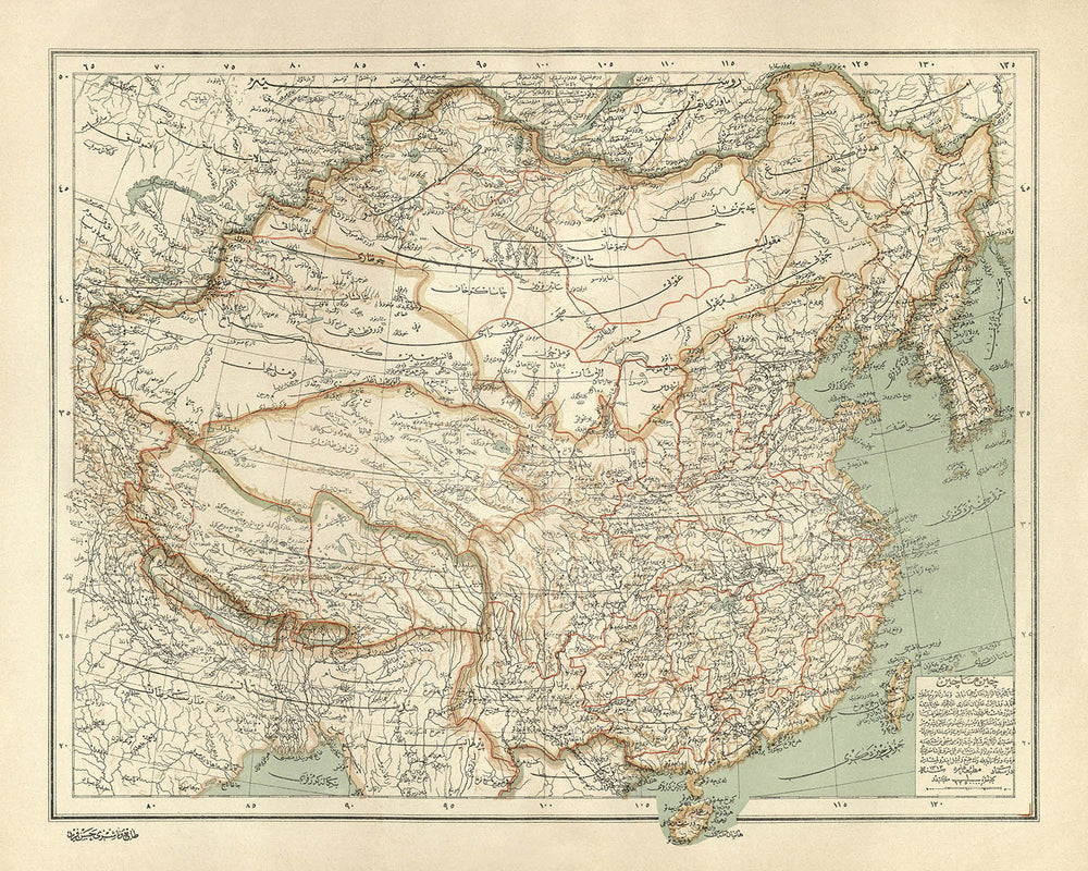 Arabic Map of China and Mongolia by Hafiz Ali Esref, 1896: Beijing, Yangtze River, Gobi Desert, Himalayas, Shanghai