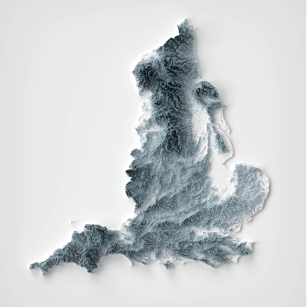 Esta representación topográfica de Inglaterra es tanto un tributo a sus formas de tierra naturales como una invitación a explorar: una obra de arte donde cada curva y contorno cuenta una parte de la historia de la nación, y donde la luz y la sombra se unen para capturar la belleza perdurable de este paisaje notable.