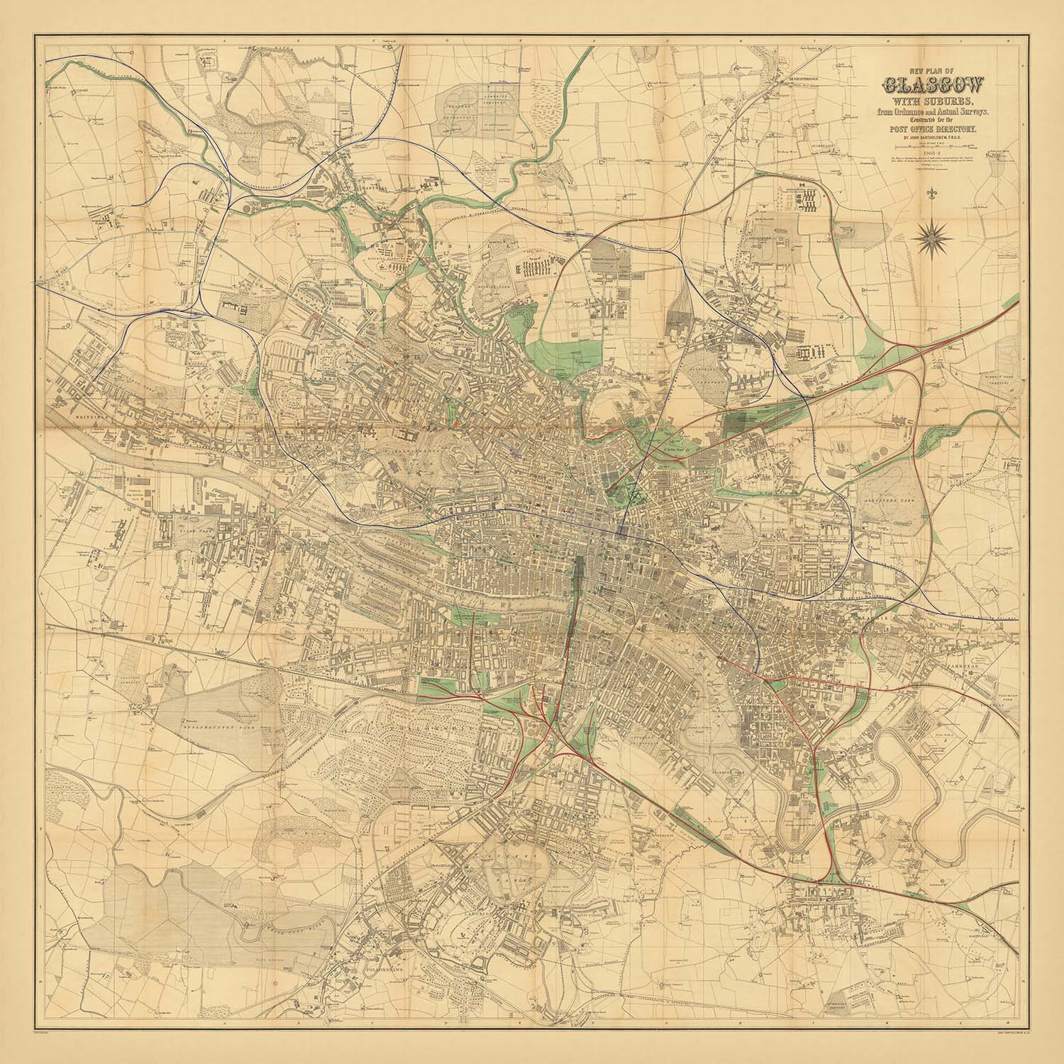 Gran mapa de Glasgow por Bartholomew, 1903: ferrocarriles, río Clyde, parques