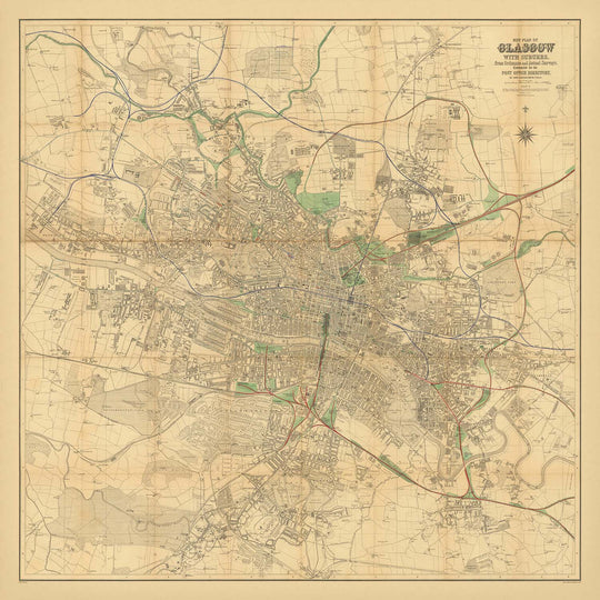 Más allá de su núcleo urbano, el mapa revela espacios verdes y parques que proporcionaron un respiro de la bulliciosa vida citadina. Estas áreas, junto con la detallada representación de las calles e infraestructura de Glasgow, reflejan el compromiso de la ciudad de equilibrar el crecimiento industrial con la calidad de vida. Este mapa no es solo una herramienta de navegación; es un documento histórico que captura el espíritu de Glasgow en un momento crucial de su historia, convirtiéndolo en una valiosa adición a cualquier colección de mapas históricos.