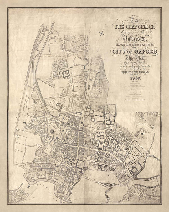 El "Plan de la Ciudad de Oxford" de Robert Syer Hoggar, elaborado en 1850, es una fascinante mirada al corazón histórico de una de las ciudades más renombradas de Inglaterra. Este mapa, producido para la investigación sanitaria de los Comisionados de Pavimentación de Oxford de 1851, no es solo una herramienta de navegación, sino un retrato detallado de la vida urbana a mediados del siglo XIX. Con su meticulosa representación de los principales edificios, colegios y límites de condados y parroquias claramente marcados, ofrece una ventana al paisaje arquitectónico y cívico de la época. La precisión y elegancia del mapa reflejan la experiencia de Hoggar como asociado de la Institución de Ingenieros Civiles.