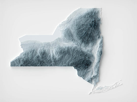 Embarca en un viaje a través de los diversos e icónicos paisajes de Nueva York con este mapa de relieve topográfico 3D elaborado de manera única. La geografía de Nueva York ofrece una mezcla ecléctica de paisajes, desde la bulliciosa expansión urbana de la ciudad de Nueva York hasta la serena belleza natural de las Montañas Adirondack.