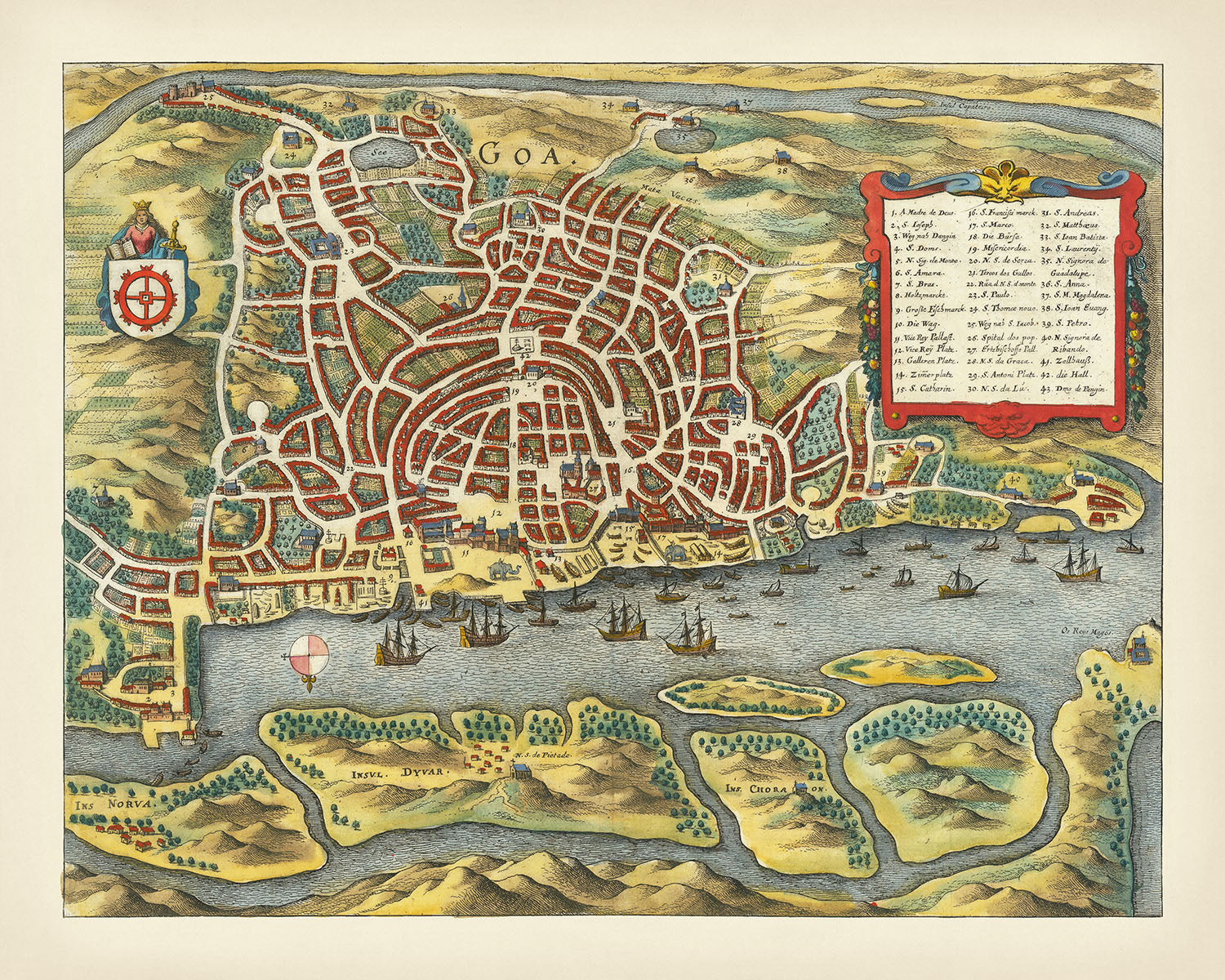 Goa, ahora un estado en la costa occidental de India, fue una vez un centro comercial central con una población de hasta 200,000. Este mapa captura la vida vibrante de la ciudad antes de que fuera abandonada en el siglo XVIII debido a una plaga. Monumentos significativos como la Iglesia de San Francisco cerca del agua y el santuario en las colinas al este, entonces dedicado a San Bras, están prominentemente destacados. El mapa también resalta el palacio del Virrey de Goa a lo largo del río, un testimonio de la importancia política de la ciudad durante el dominio portugués.