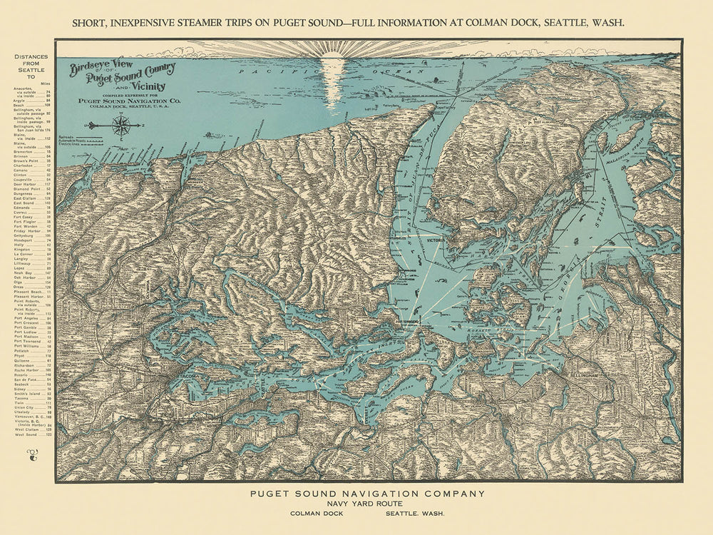 Step into the vibrant maritime world of the Pacific Northwest with the “Birdseye View of Puget Sound Country and Vicinity,” an evocative 1927 cartographic masterpiece commissioned by the Puget Sound Navigation Company. This captivating map, crafted at the height of the region’s steamboat era, invites viewers to explore a landscape defined by its intricate waterways, majestic mountains, and lush islands. The original title itself hints at the map’s panoramic ambition, offering a sweeping perspective that encompasses the Puget Sound, Olympic Peninsula, San Juan Islands, Vancouver Island, and the surrounding region—an area where nature and navigation intertwine in spectacular fashion.