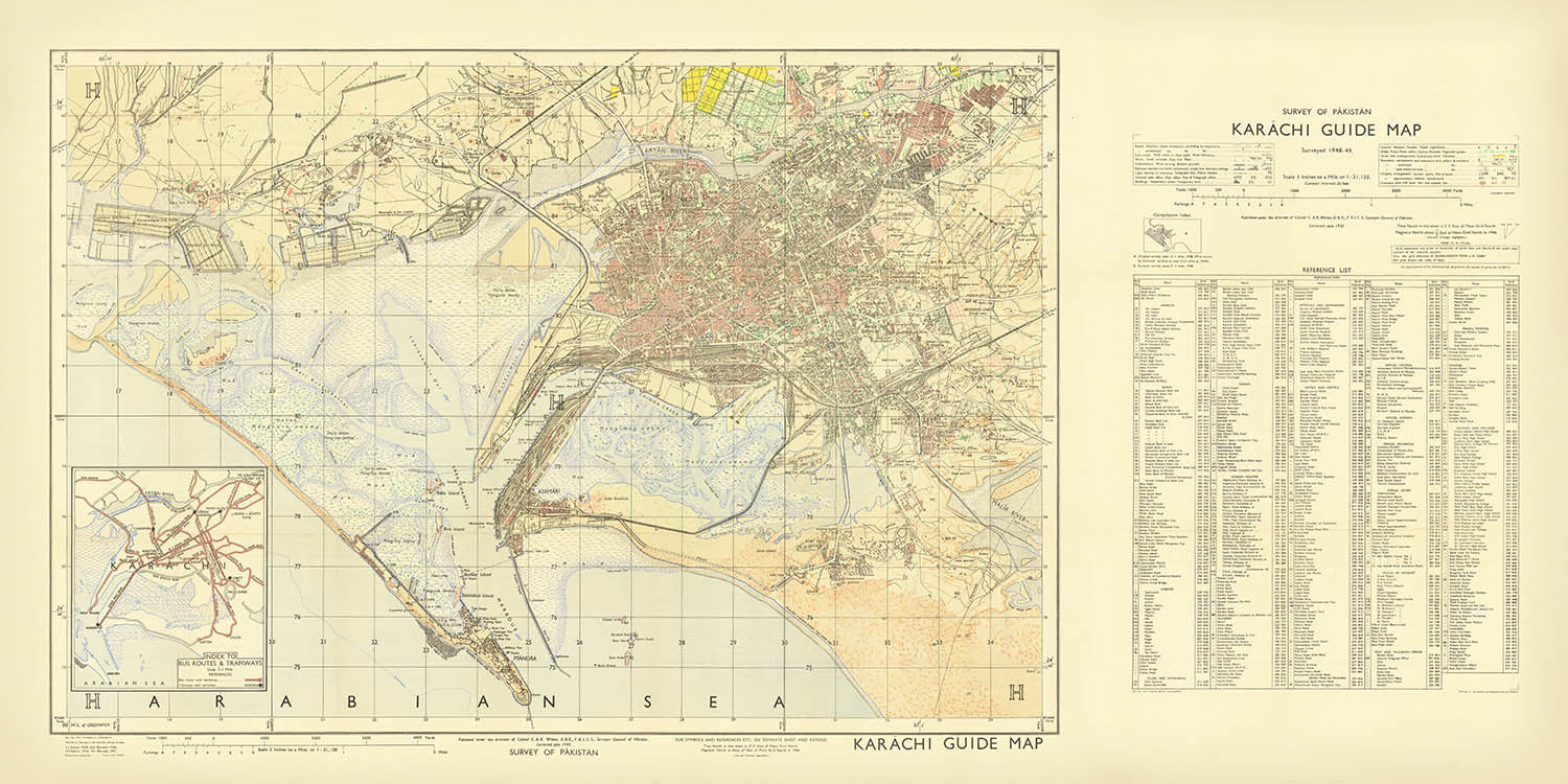 El "Mapa Guía de Karachi," elaborado por el General de Encuestas de Pakistán en 1929, ofrece una fascinante visión de la tapicería histórica de Karachi durante una era transformadora. Este exquisito mapa, una joya de la cuarta edición, es más que una herramienta de navegación; es una instantánea vibrante de una ciudad al borde de la modernidad. Con su intrincado código de colores y su detallado sistema de cuadrícula, guía al espectador a través de las bulliciosas calles y vecindarios que definieron a Karachi poco después de convertirse en la capital de Pakistán. El meticuloso diseño del mapa captura la esencia de una ciudad que se adapta al aflujo de refugiados musulmanes tras la independencia, convirtiéndolo en un artefacto histórico significativo.