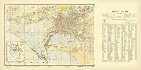 Karachi, una ciudad de contrastes y convergencias, cobra vida a través de este mapa, mostrando sus notables vecindarios como Saddar, Clifton y Lyari. Cada área está impregnada de historia, ofreciendo una ventana a las diversas dinámicas culturales y sociales que dieron forma a la ciudad. La atención al detalle del mapa resalta el vibrante paisaje urbano, donde la arquitectura colonial y los bulliciosos mercados coexistían, reflejando el rico patrimonio y la identidad en evolución de la ciudad.