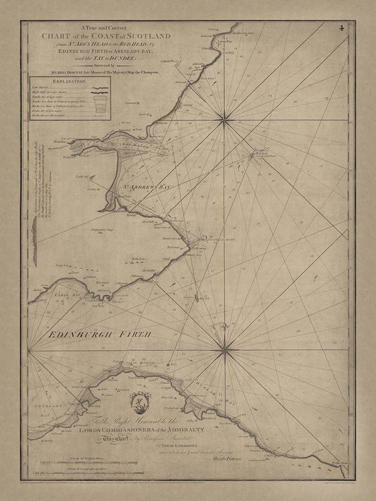 La carta está rica en datos de navegación, incluyendo sondeos de profundidad meticulosamente medidos en brazas, asegurando un paso seguro para las embarcaciones que navegan por estas aguas. Las rosas de los vientos y las líneas de rumbo radiales se muestran de manera prominente, guiando a los marineros a través de las complejidades del Firth de Edimburgo, la Bahía de St Andrew y otras áreas costeras. La inclusión de estos elementos refleja la precisión y la practicidad del trabajo cartográfico de Downie, que fue encargado por los Lords Commissioners of the Admiralty para apoyar los esfuerzos marítimos.