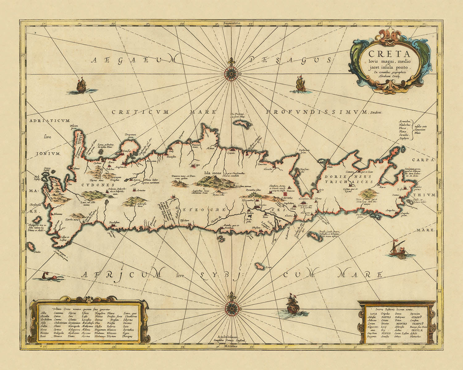 Geográficamente, el mapa proporciona una vista detallada de Creta, mostrando sus montañas, ríos y otras características naturales. Los límites de la isla están meticulosamente dibujados, destacando la dedicación del cartógrafo a la precisión. Los cuerpos de agua que rodean Creta, como el Aegaeum y el Creticum Mare, están etiquetados de manera prominente, enfatizando la ubicación estratégica de la isla en el Mediterráneo. Esta atención al detalle subraya el valor del mapa tanto como documento histórico como pieza de arte.